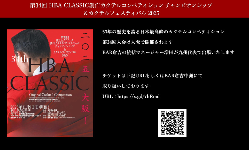 | 第13回HBAカクテルコンペティション1984優勝カクテル。倉吉浩二作。胡麻焼酎をベースにフランボワーズでフルーティーな逸品。 |